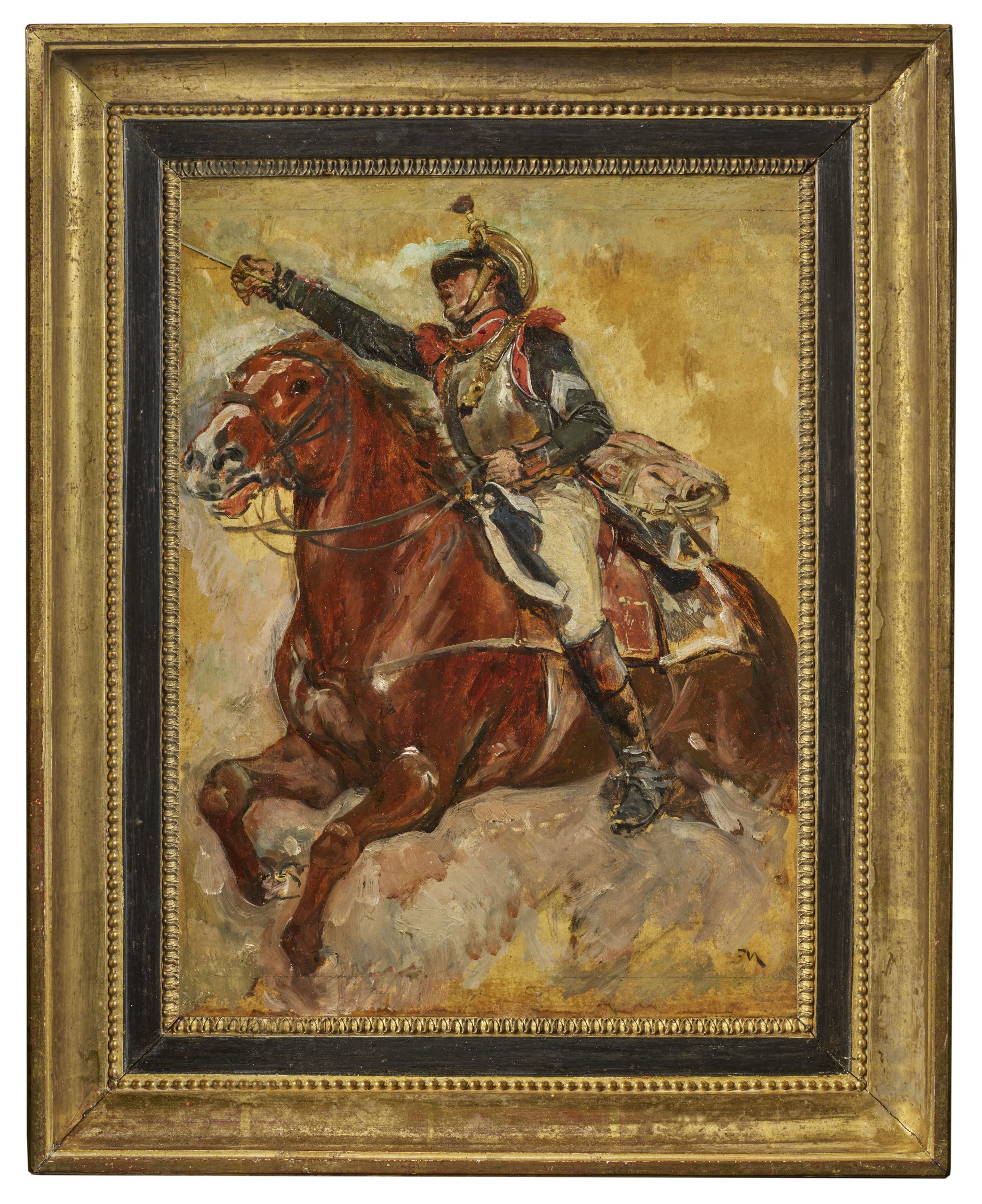Notre huile sur panneau fut brossée dans la même démarche. Il s’agit d’une étude pour l’un des cuirassiers du premier rang au milieu à droite de l’une des plus remarquables compositions du peintre : 1807, Friedland. L’artiste, empreint d’une méticulosité sans précédent, multiplia les études pour saisir au mieux les protagonistes et leur monture dans les premiers instants de la charge. Considéré comme un peintre historien, Meissonier est connu pour la rigueur avec laquelle il représentait les costumes, qu’il collectionnait d’ailleurs avec passion. Son implication se manifestait également à travers les témoignages d’anciens combattants des guerres napoléoniennes qu’il recueillait pour recréer avec le plus de fidélité possible les scènes qu’il peignait.