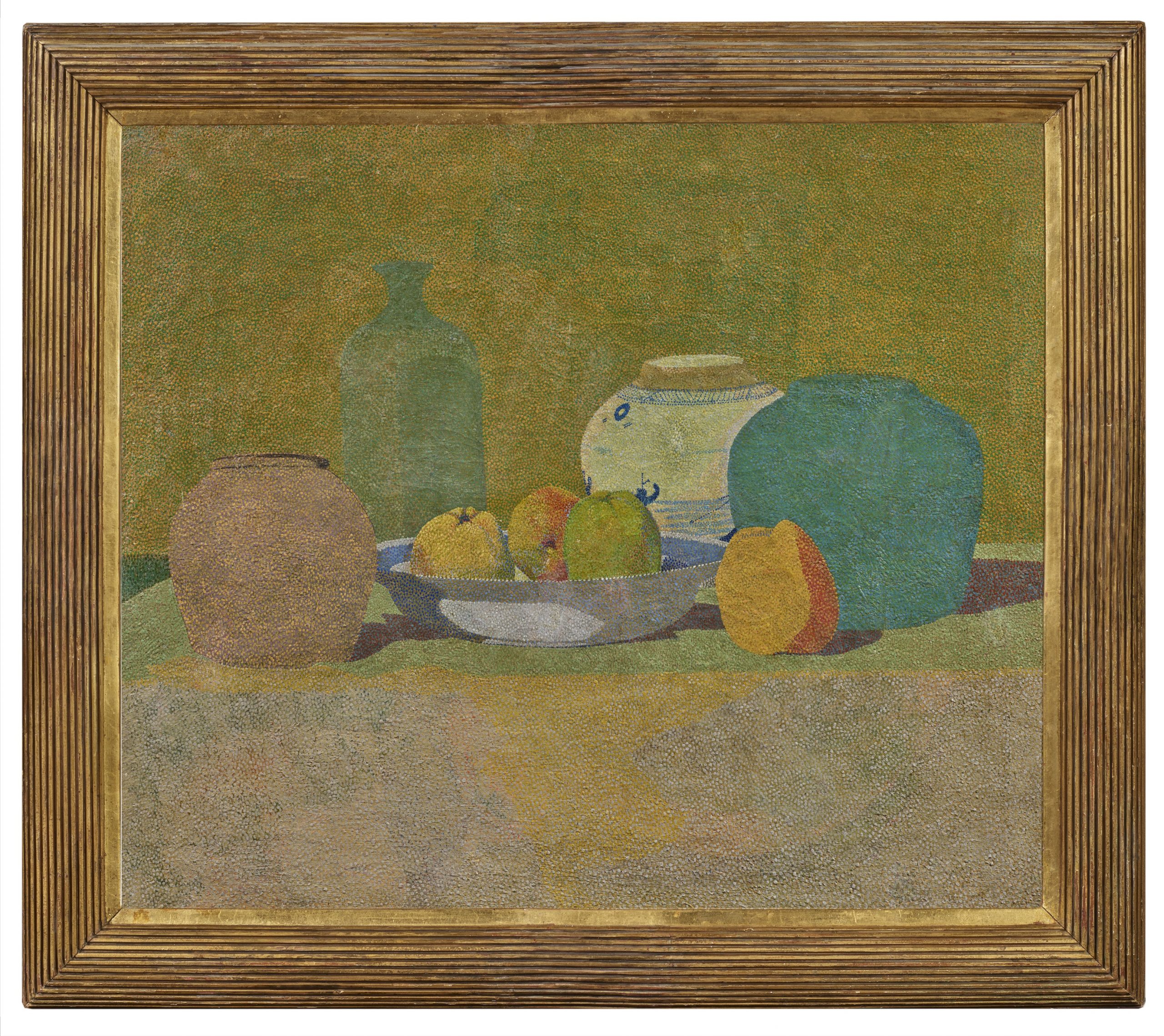 Notre Nature morte de fruits et de pots est tout à fait caractéristique de la production de Bremmer entre 1895 et 1905. L’artiste, résolument pointilliste, mais qui était également très intéressé par le courant luministe de l’époque, représentait en effet des objets simples, de la vie de tous les jours, dont l’arrangement, sobre mais parfaitement étudié, les jeux d’ombres colorées, ainsi que la palette toujours lumineuse et délicate mettait en valeur la technique pointilliste du jeune peintre. Très personnelle, sa touche toute en matière, conférait à ses œuvres un aspect très particulier, proche du galuchat, comme on peut le voir sur notre toile.