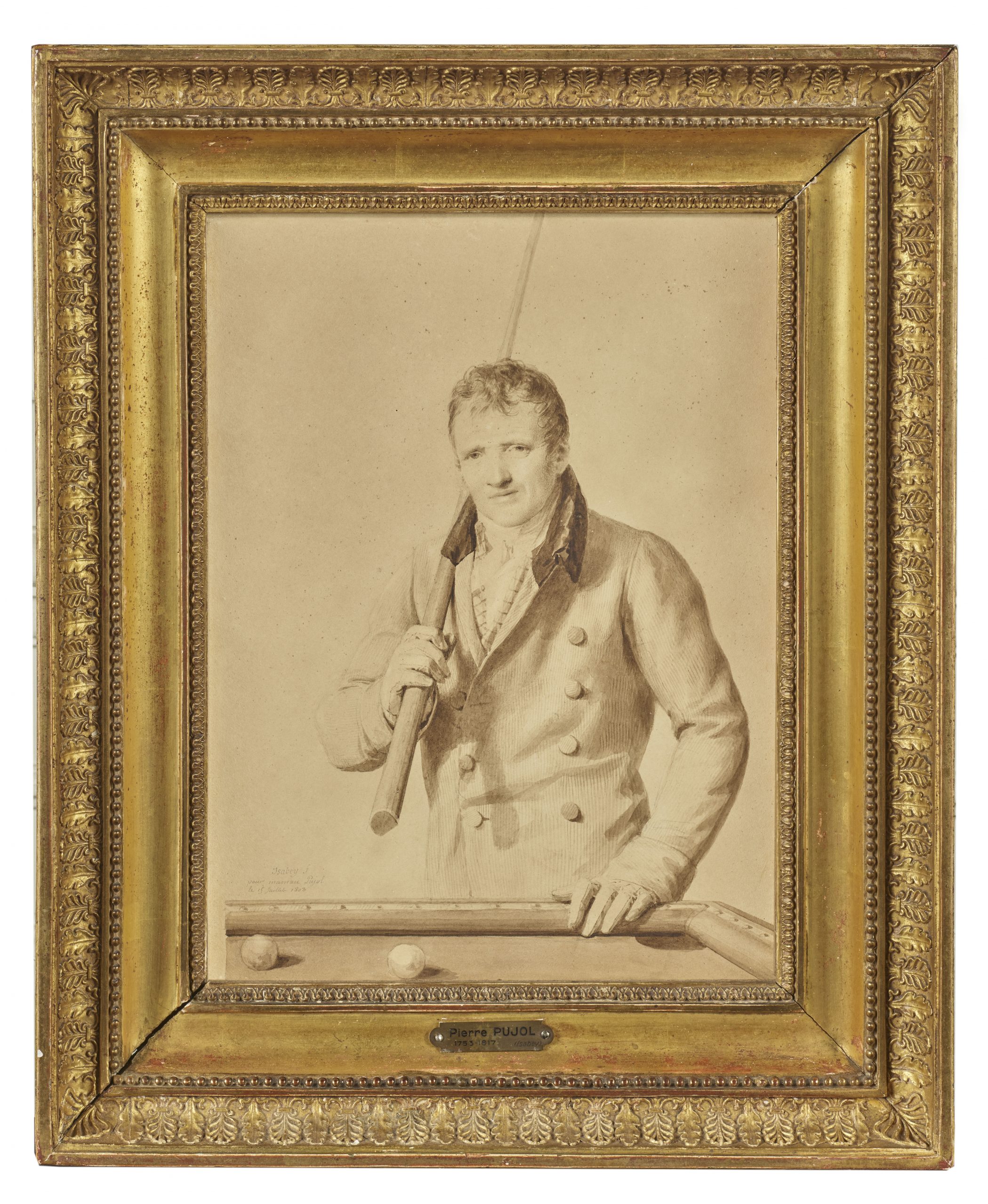Dans ce portrait d’une grande modernité, notamment en raison de son cadrage, le tenancier est saisi à mi-corps, les jambes occultées par une table de billard, tenant la canne de sa main droite en la posant sur son épaule. La pose du modèle, suggérant une légère mise en scène, met en valeur la proximité qu’il entretient avec le peintre, soulignée par ce franc sourire et ce regard qui l’invite à jouer. Enfin, la dédicace inscrite par Isabey vient corroborer l’idée d’une relation amicale sincère. Ce portrait, dressé avec légèreté et lavé avec parcimonie constitue donc un témoignage saisissant de l’intimité et des amitiés vécues par l’un des portraitistes et décorateurs les plus fameux du début du XIXe siècle en France.