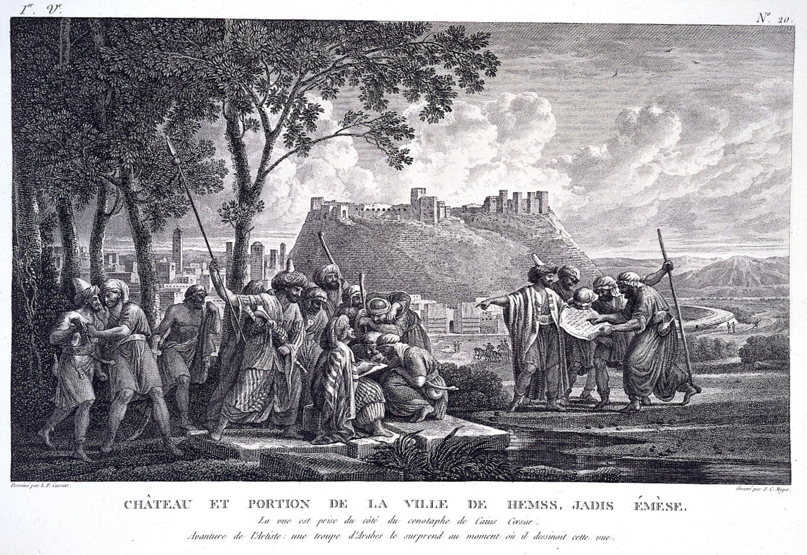 Au-delà des quelques arbres qui garnissent la gauche de la scène, s’étend la ville de Homs, dont les tours guident le regard jusqu’au pied de la citadelle où semble se dresser les vestiges d’une porte antique. D’ailleurs, la lettre de l’eau-forte indique que cette vue de Homs fut prise du côté du cénotaphe de Caïus Cæsar. Non visible sur notre feuille mais certainement à proximité, Cassas est l’une des rares personnes dans l’Histoire à avoir représenté ce monument. Le naturaliste français Pierre Belon (1517-1564) s’intéressa parmi les premiers aux inscriptions qu’il portait et en déduit qu’il s’agissait du cénotaphe du petit-fils d’Auguste, Caius Julius Caesar Vipsanianus (20 av. J.-C. – 4 ap. J.-C.). Cependant, des études datant du XIXe siècle remirent en cause ces conclusions, privilégiant plutôt l’hypothèse d’un bâtisseur local, Caius Julius Alexion, un membre de la dynastie locale des Sampsigéramides, soumise par Pompée à la République romaine au Ier siècle av. J.-C. Aujourd’hui, ces vestiges n’existent plus, puisqu’ils furent dynamités en 1911 pour construire une réserve de pétrole. De ce fait, les représentations de Cassas contenues dans son Voyage pittoresque de la Syrie, de la Phénicie, de la Palestine et de la Basse-Egypte, constituent un témoignage rare du passé romain de la province syrienne.